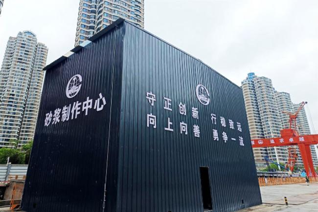 8月27日,在武漢地鐵12號線(xiàn)博覽路站施工現場(chǎng),工地一側的砂漿制作中心高8.5米,寬4米,長(cháng)10米,采用塑料彩鋼板制作,可以隔絕揚塵、噪聲污染。武漢地鐵股份公司業(yè)主代表雷凱介